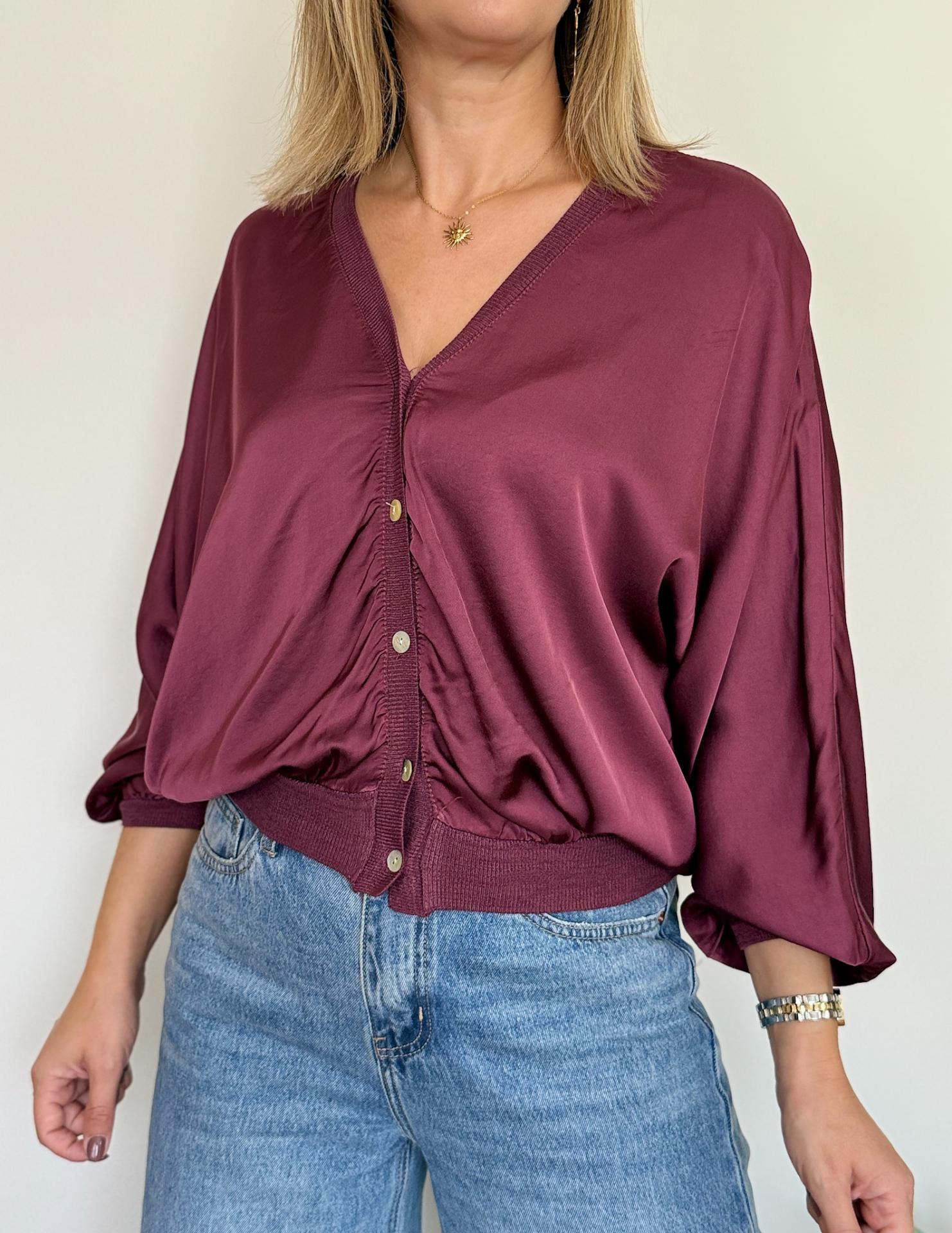 Blusa ou casaco acetinado bordô. Mangas 3/4.