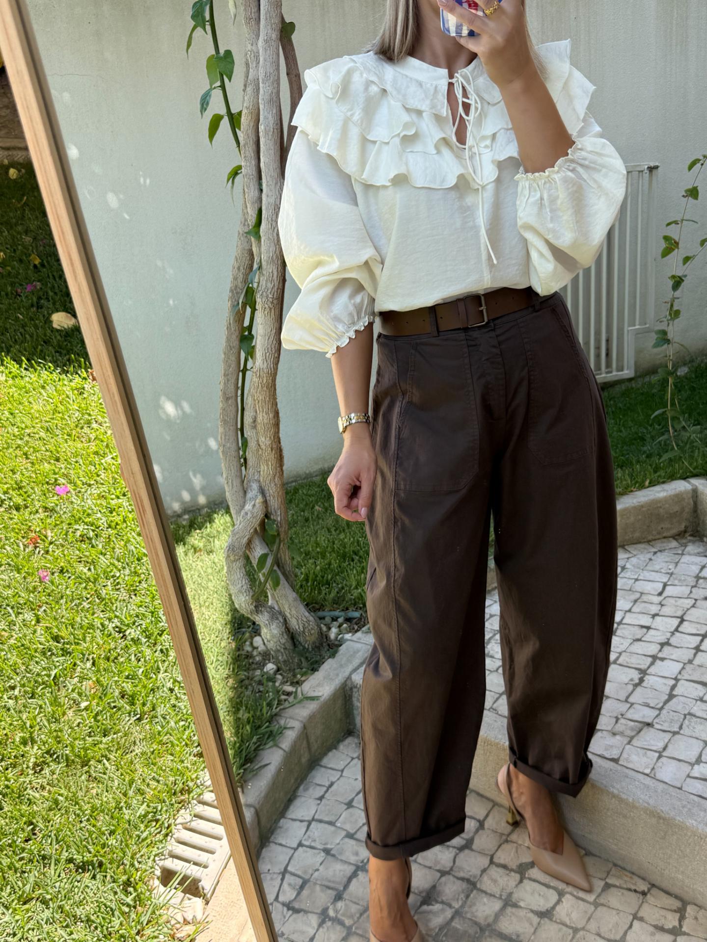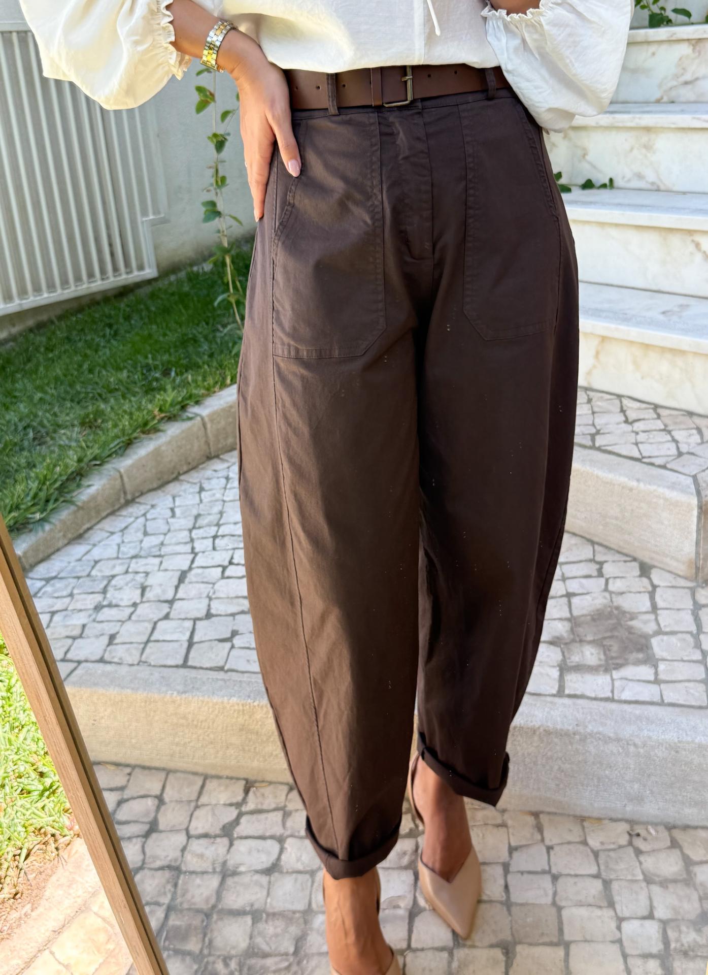 Calças modelo tendência Balloon tom chocolate/ castanho com bolsos e cinto castanho incluído. Cintura parte de trás elástica.