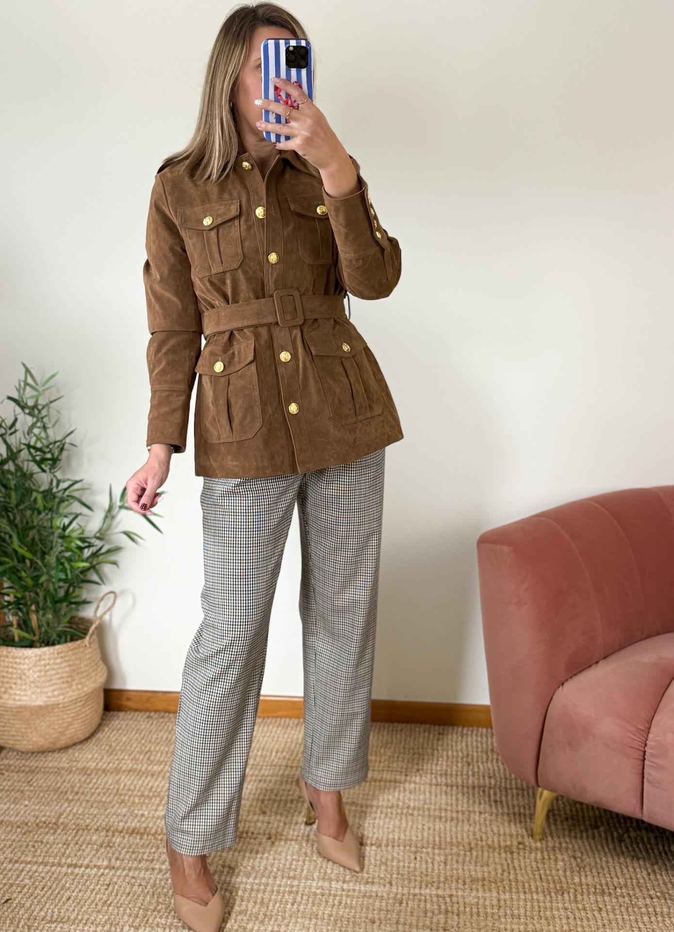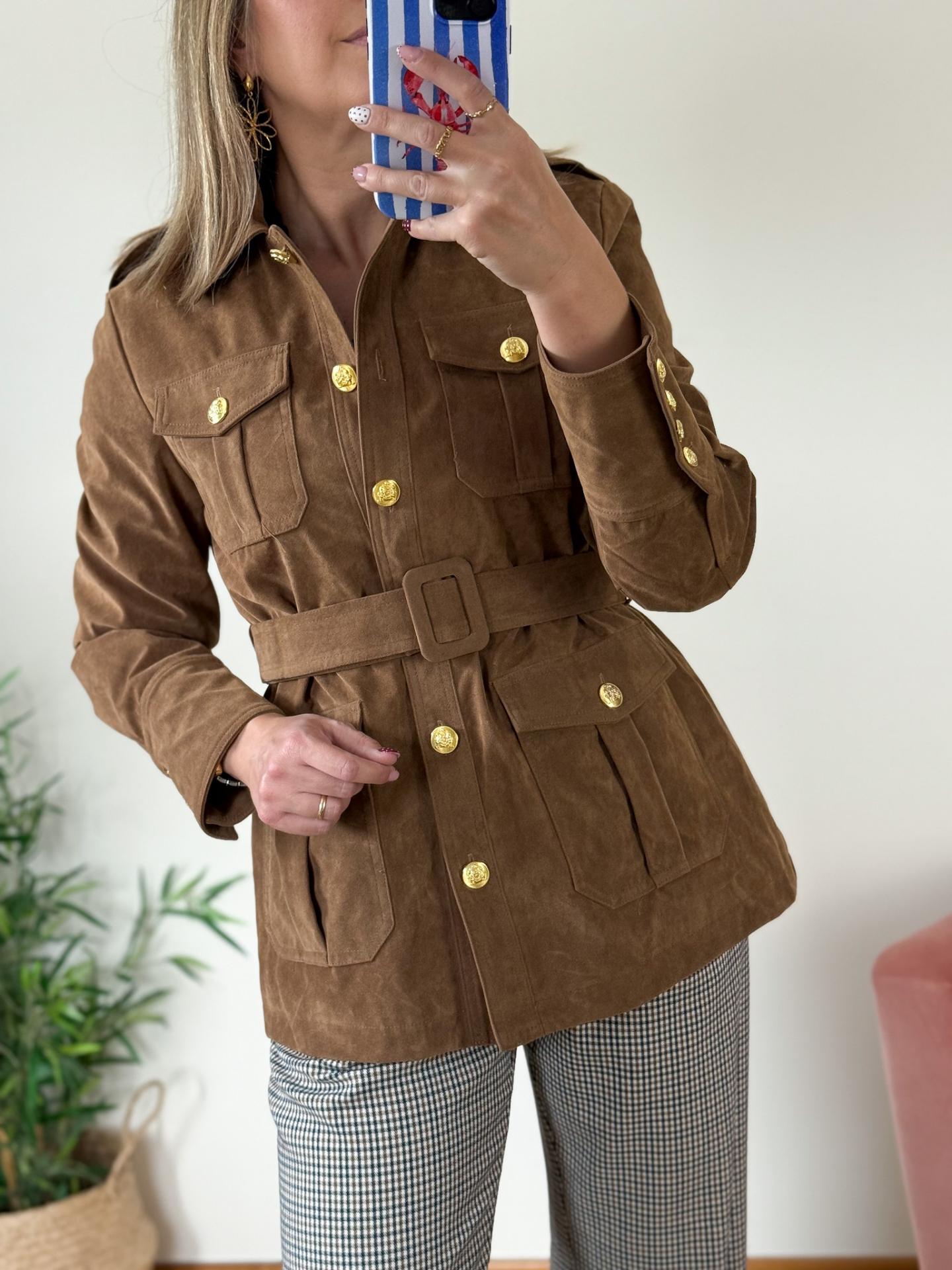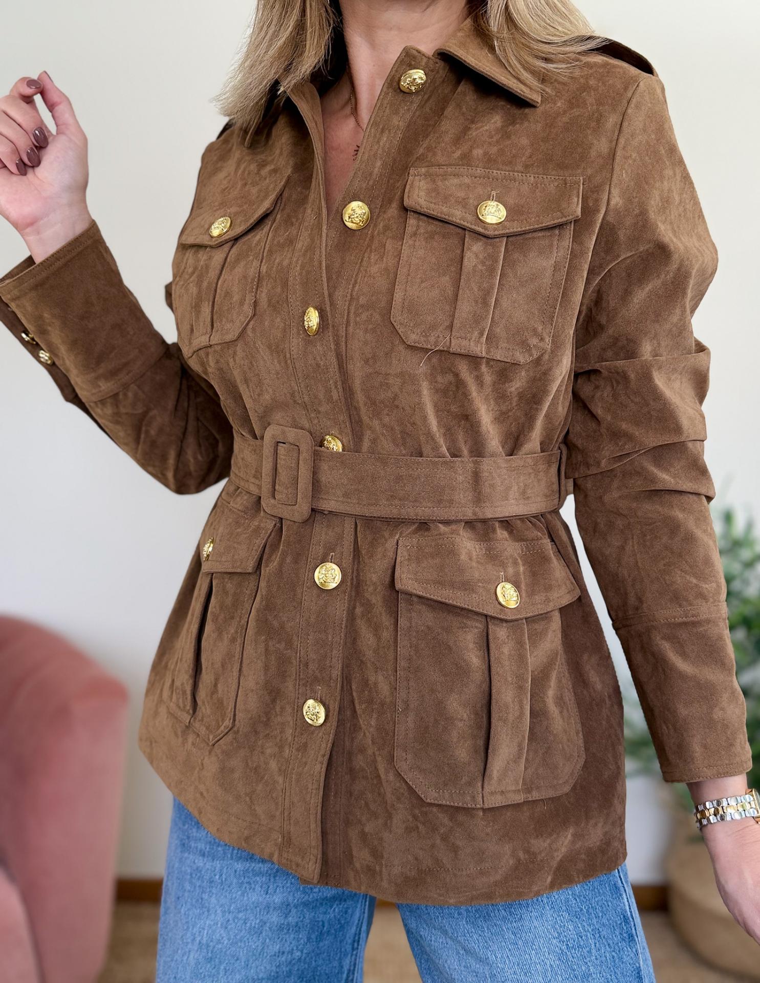 Casaco de camurça sintética com cinto e botões dourados. Leva forro. Super Tendência!