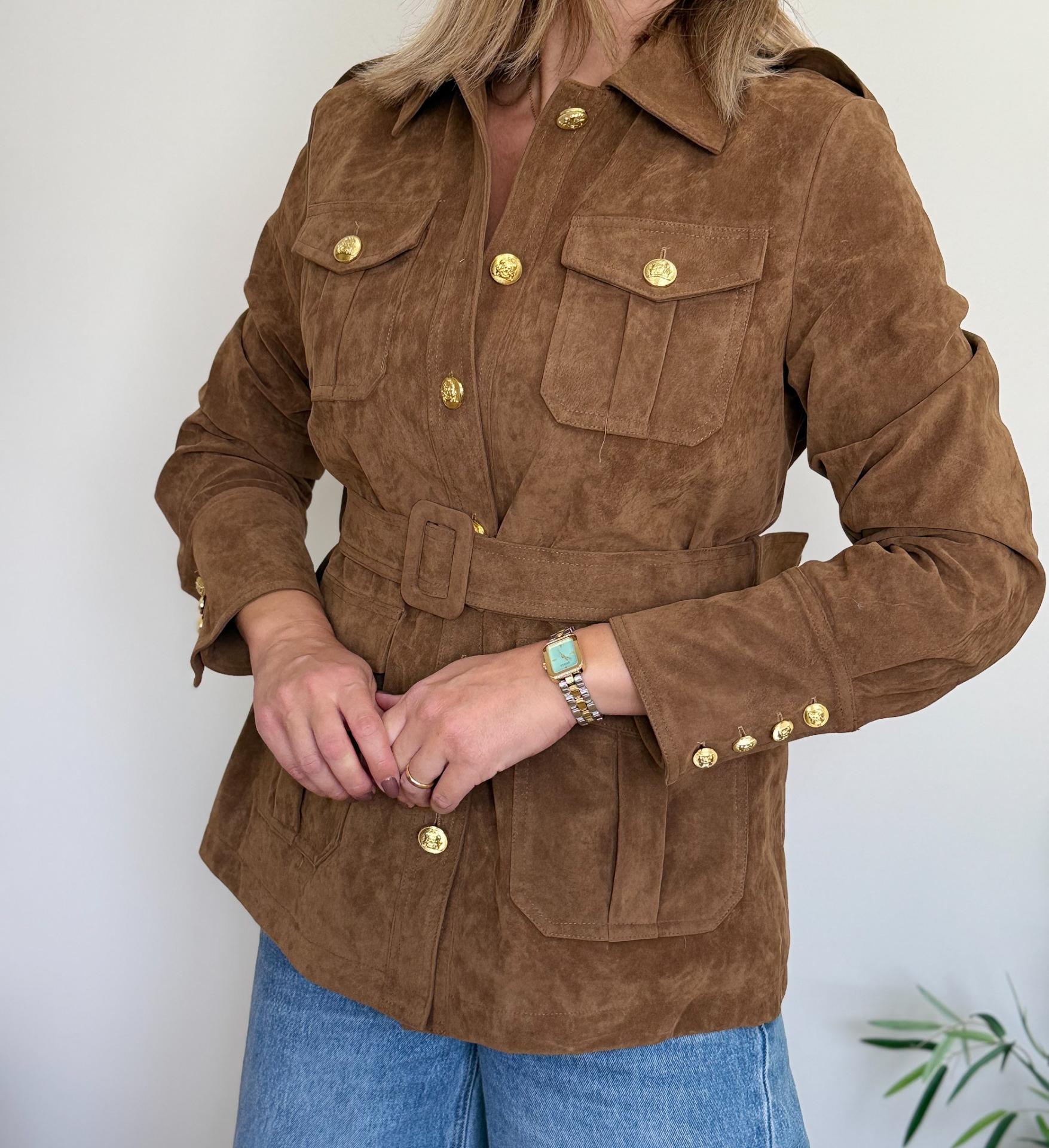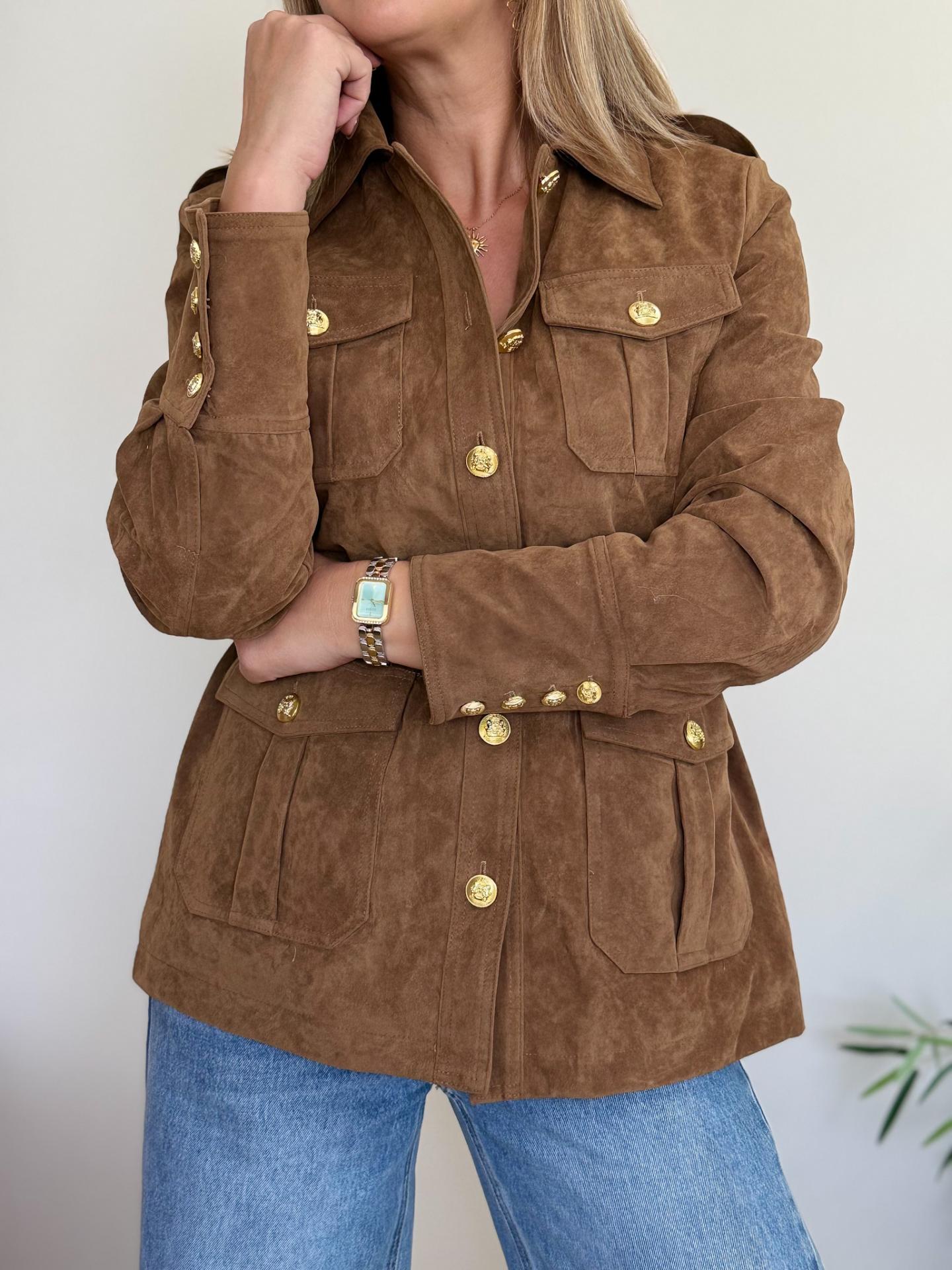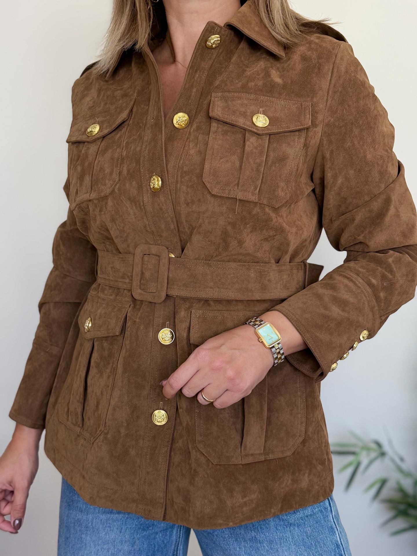 Casaco de camurça sintética com cinto e botões dourados. Leva forro. Super Tendência!
