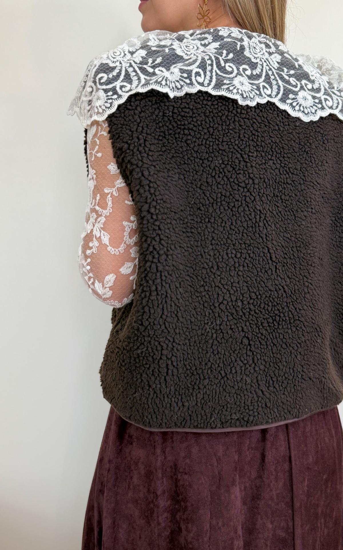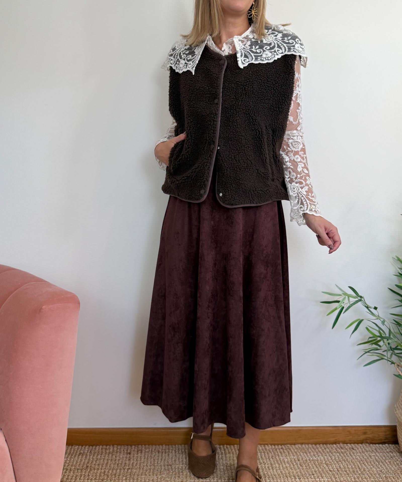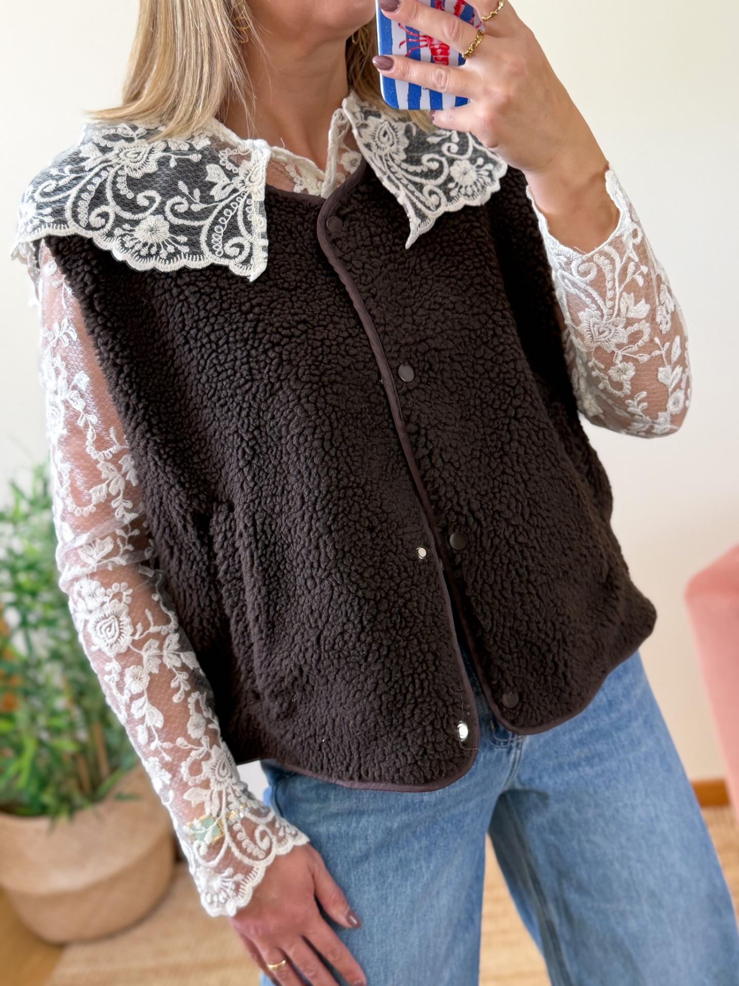 Colete de pelo tom chocolate, fecha com mola de pressão e é forrado. Possui 2 bolsos.
