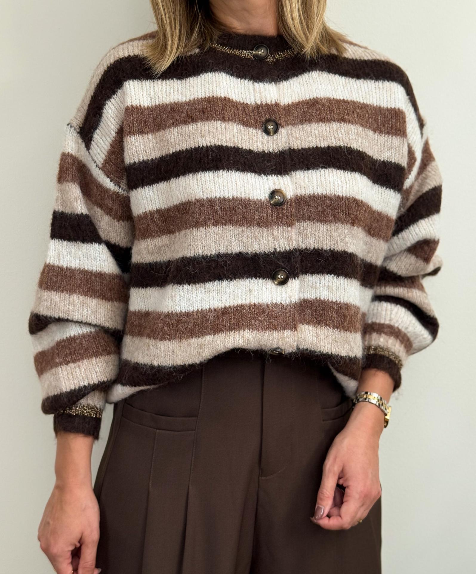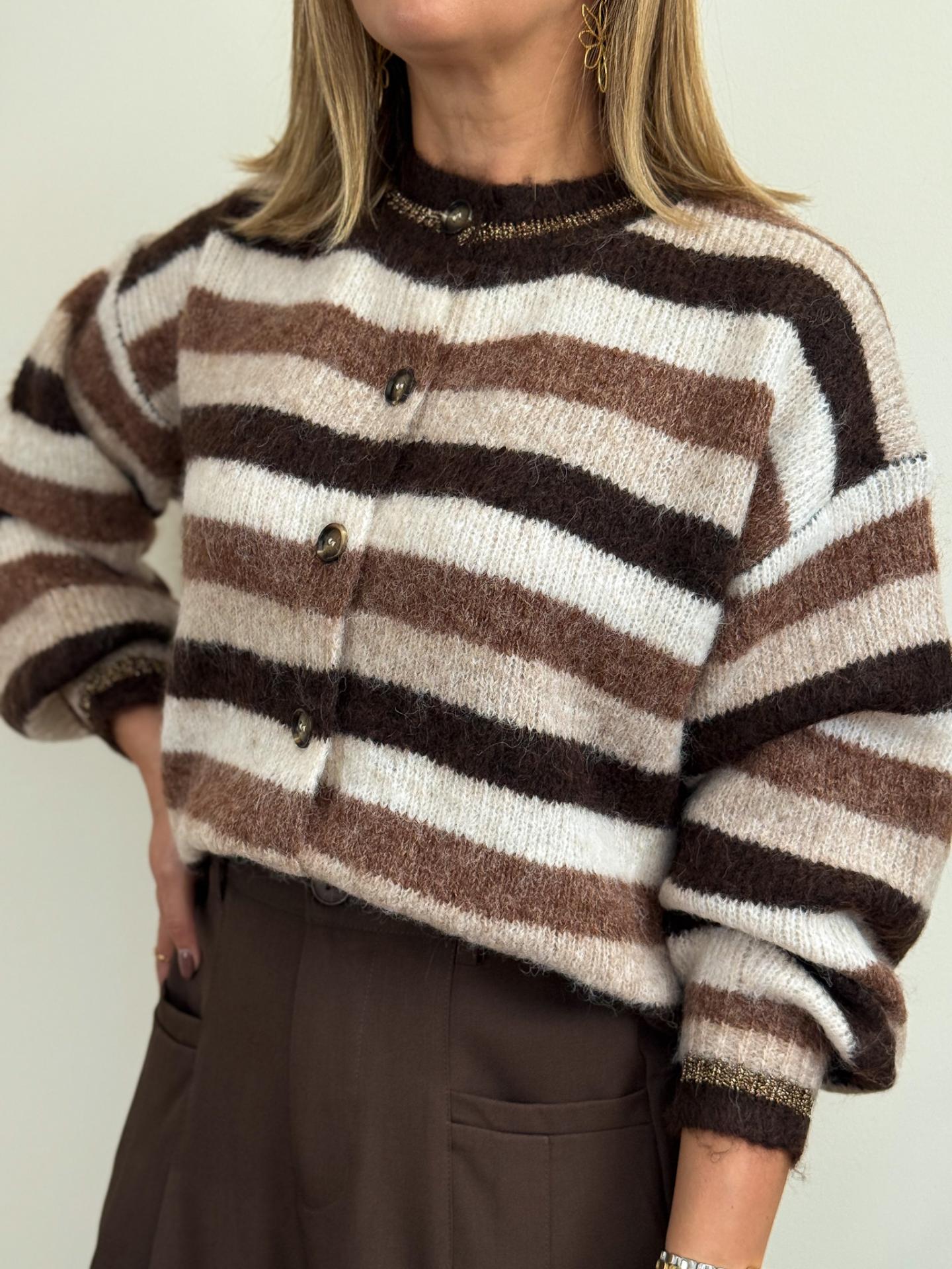 Cardigan riscas em tons de chocolate, bege, branco e camel com detalhe na gola, punhos e em baixo de risca de malha dourada.