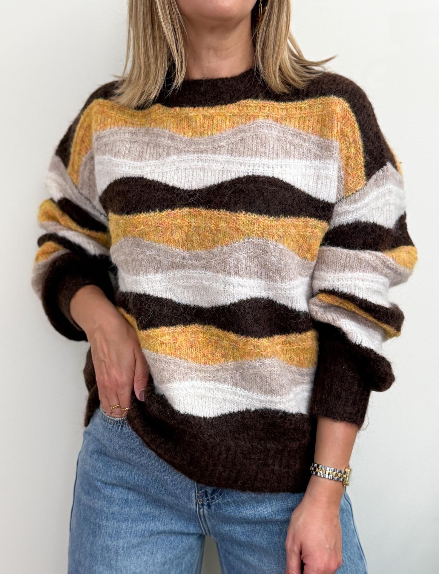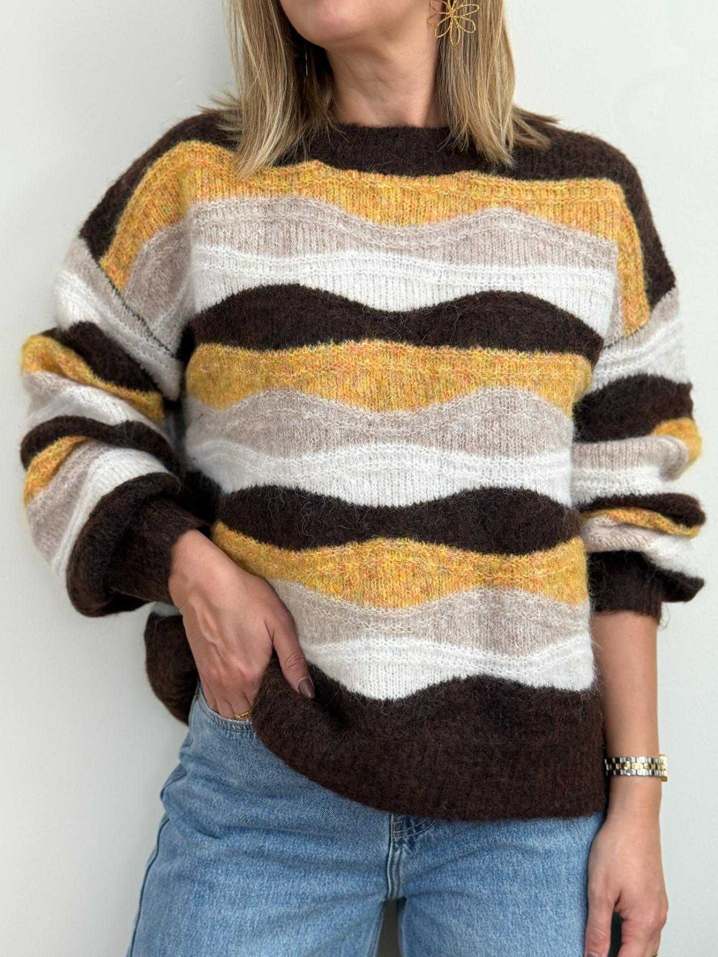 Camisola em tons de chocolate, bege, branco e mostarda.