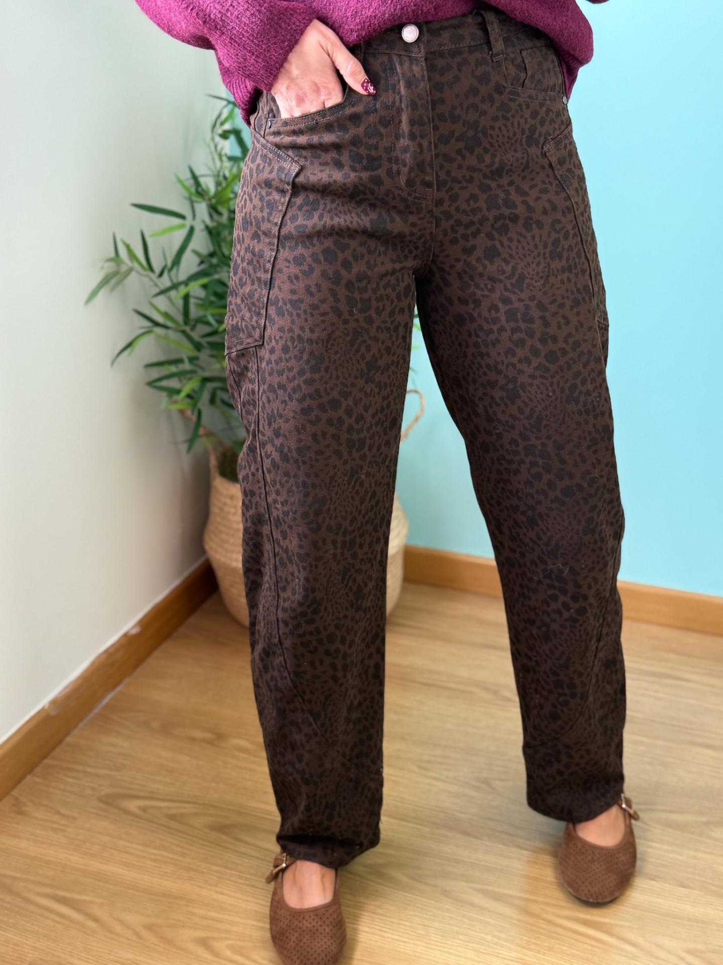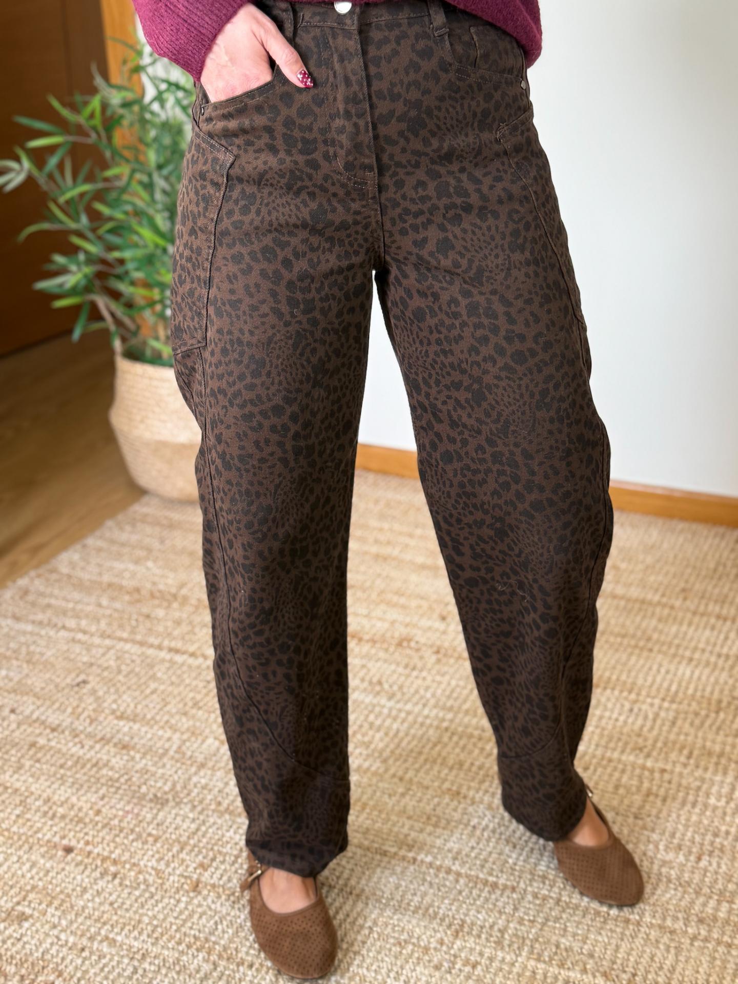 Jeans LEopardo modelo Barrel. A super tendência desta temporada! Tem elasticidade.
