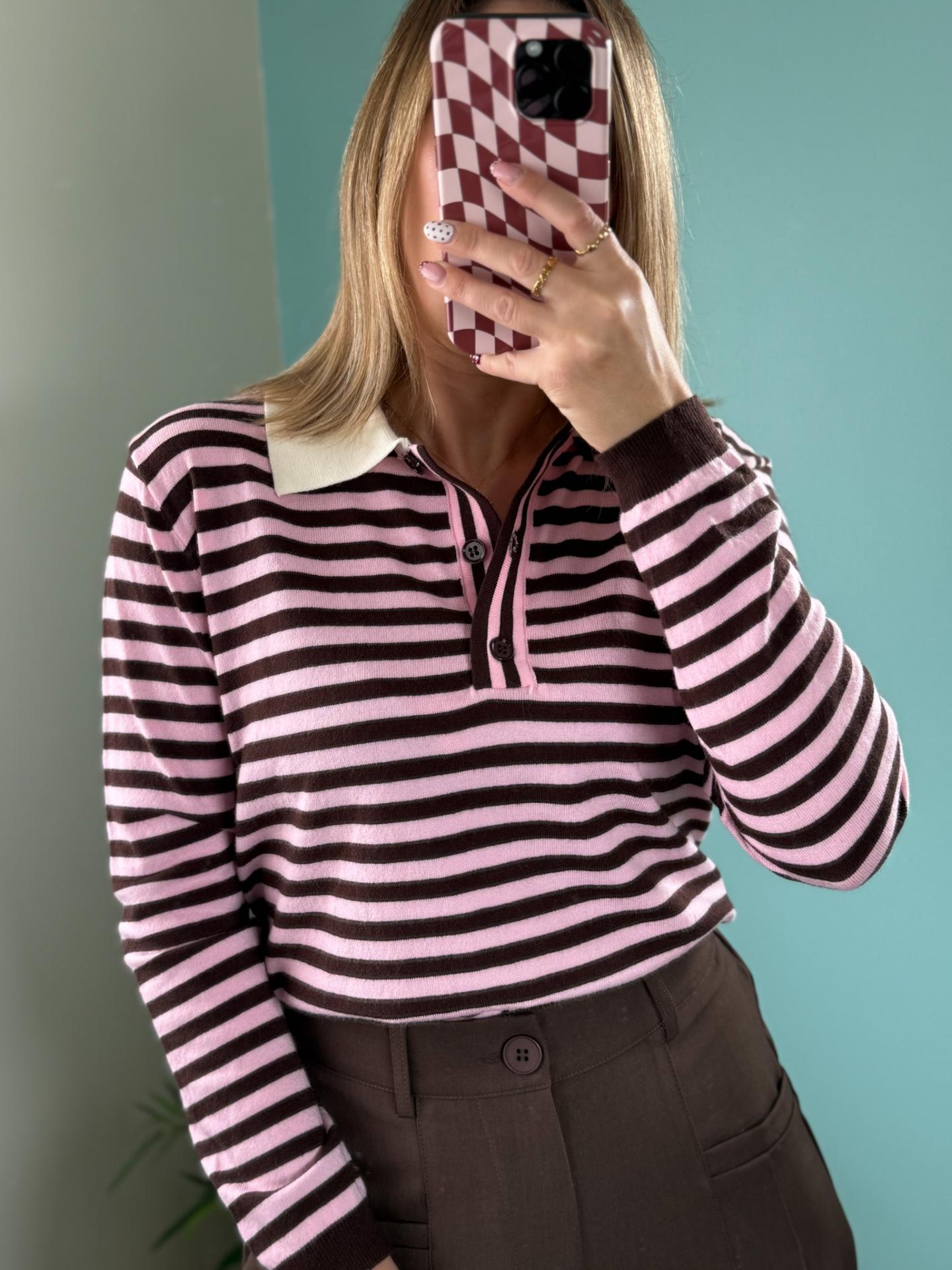 Camisola com gola abotoada na frente com riscas rosa e chocolate. SUPER TENDÊNCIA!