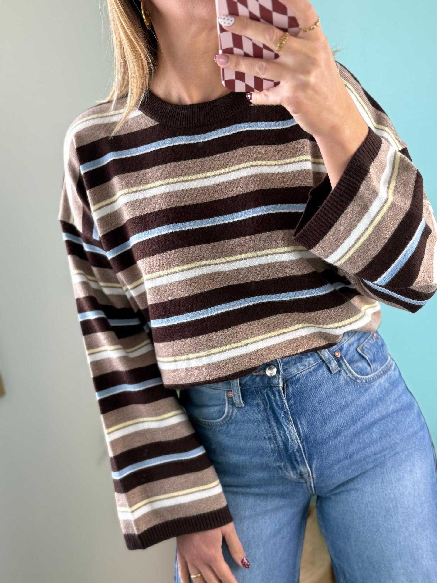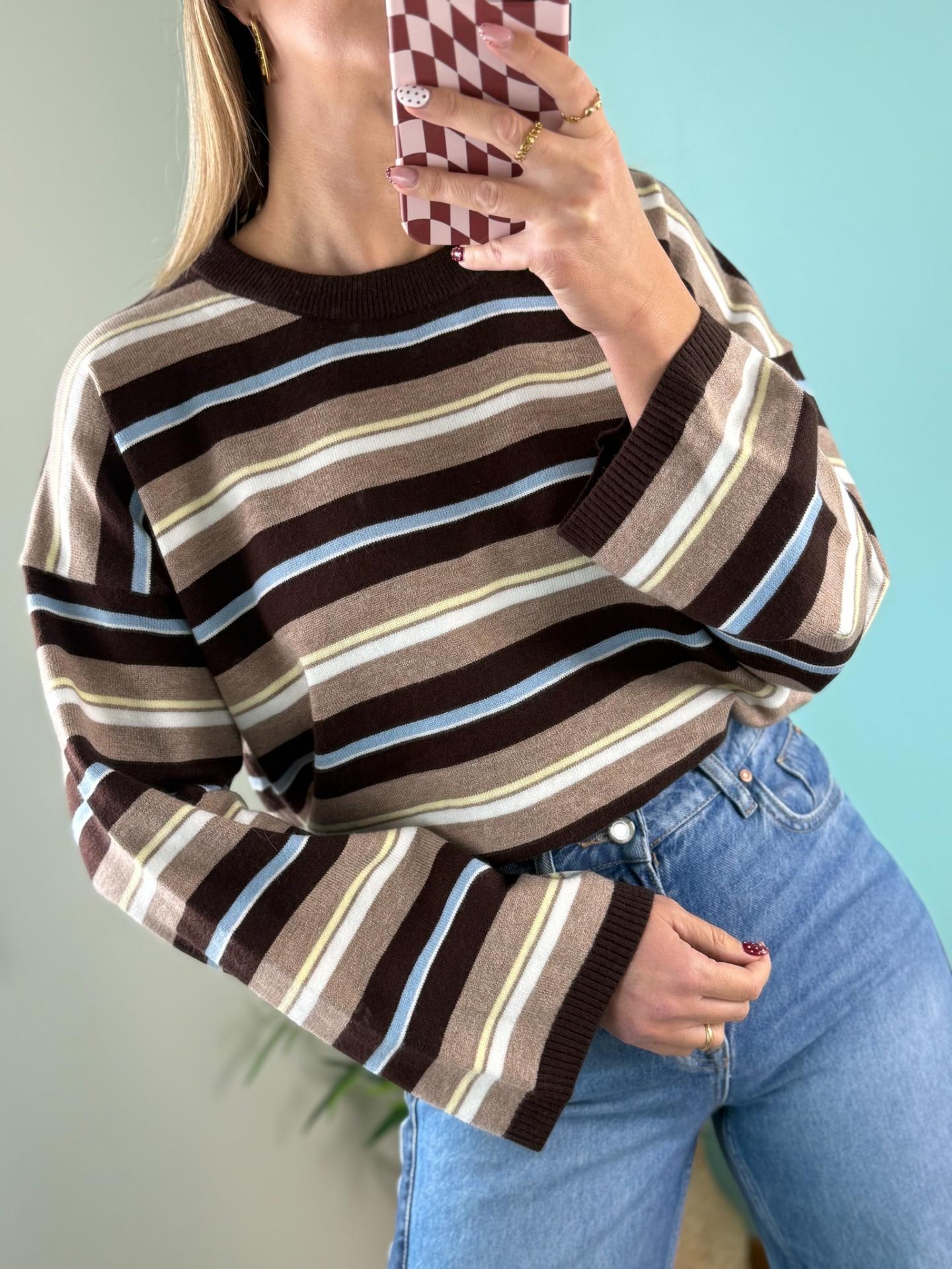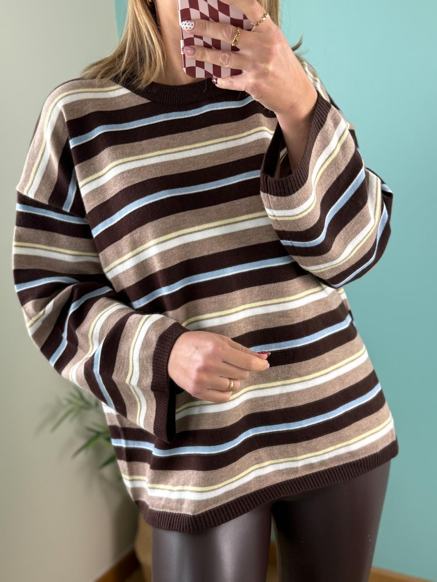 Camisola riscas em tons de amarelo manteiga, azul, taupe, branco e chocolate. Um modelo oversize que te permite usar com umas leggins ou com uns jeans!! Usa também com um camiseiro branco por baixoe também fica TOP!