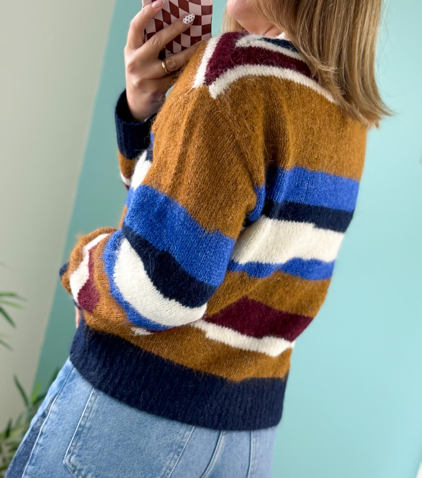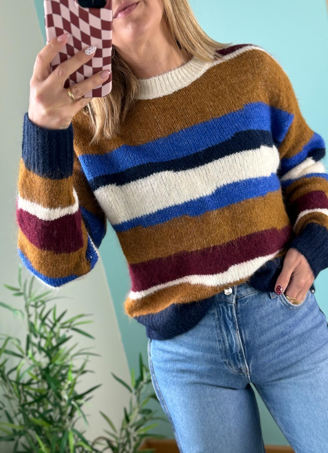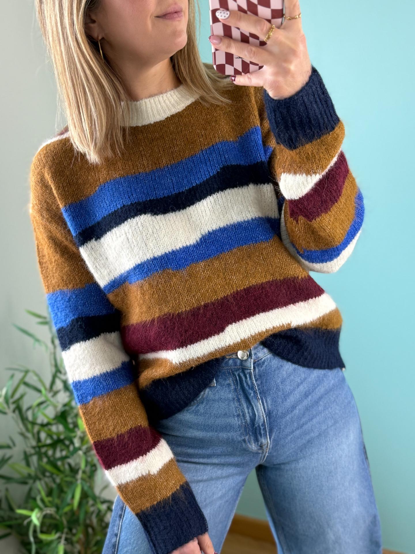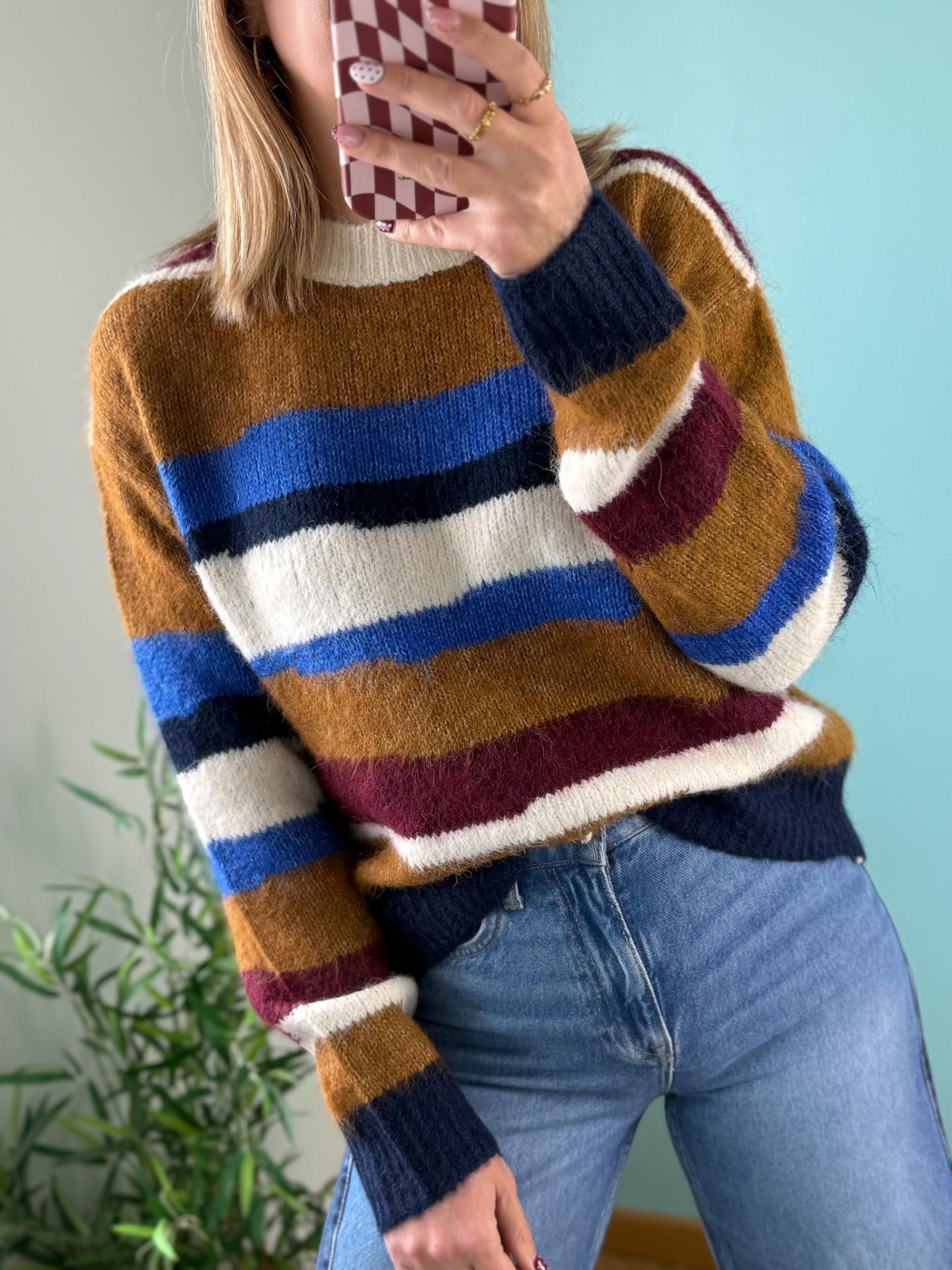 Camisola riscas em tons de azulão, camel, branco e bordô. Um modelo que conjuga super bem com os teus jeans!!