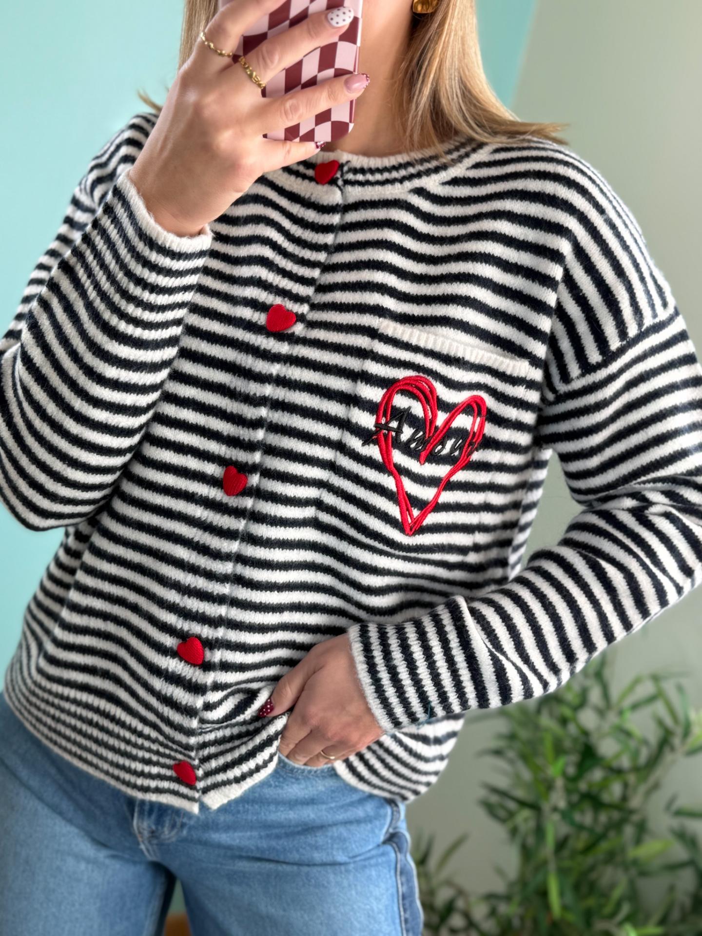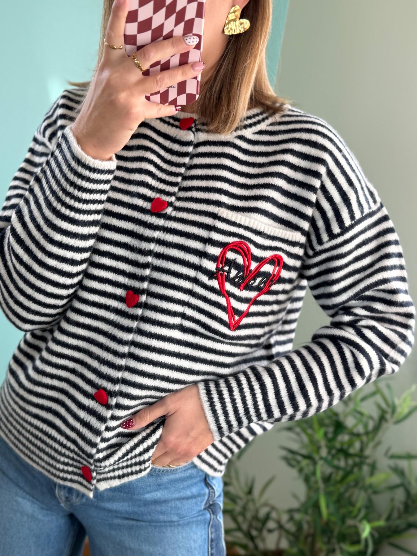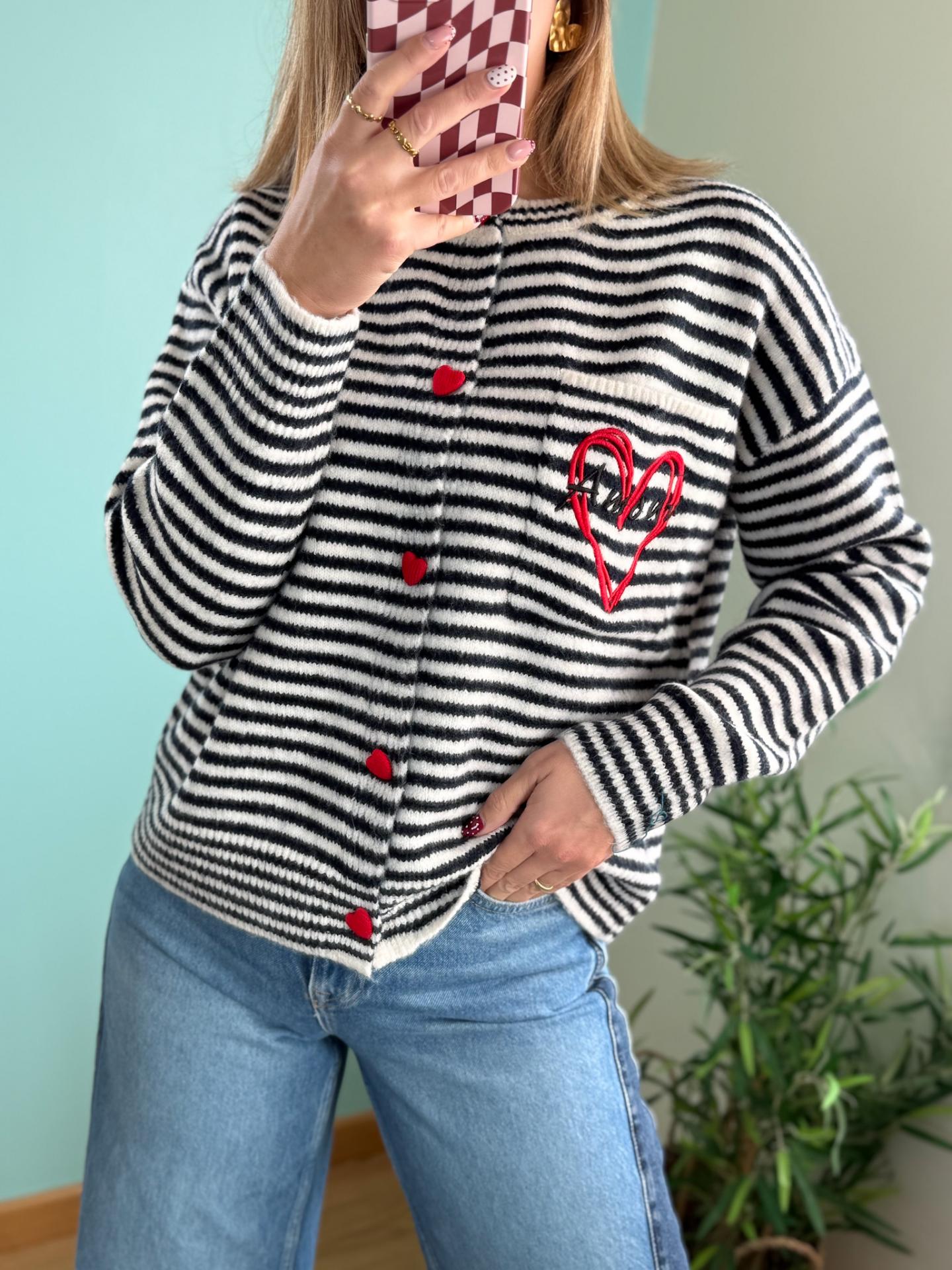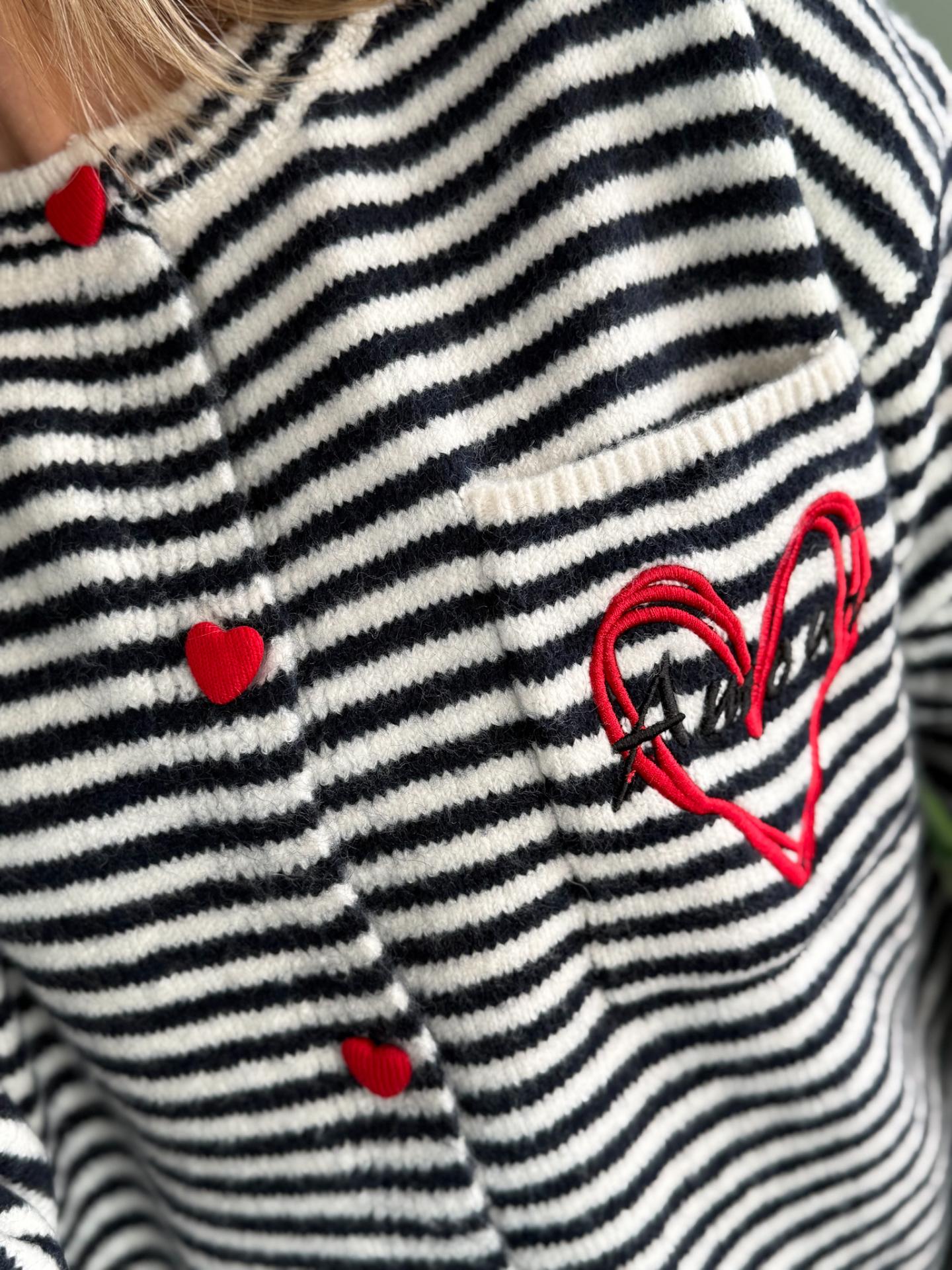Cardigan com riscas azuis e brancas com botões em forma de coração forrados a malha vermelha.