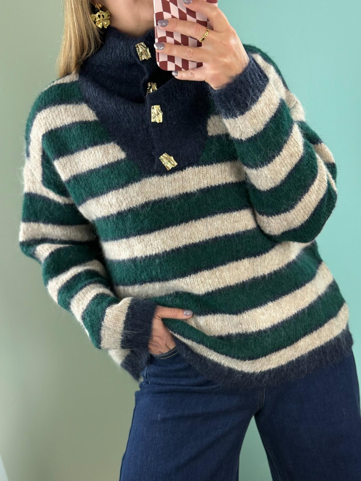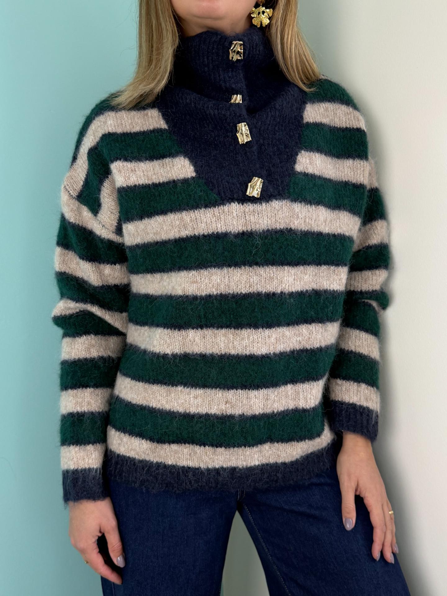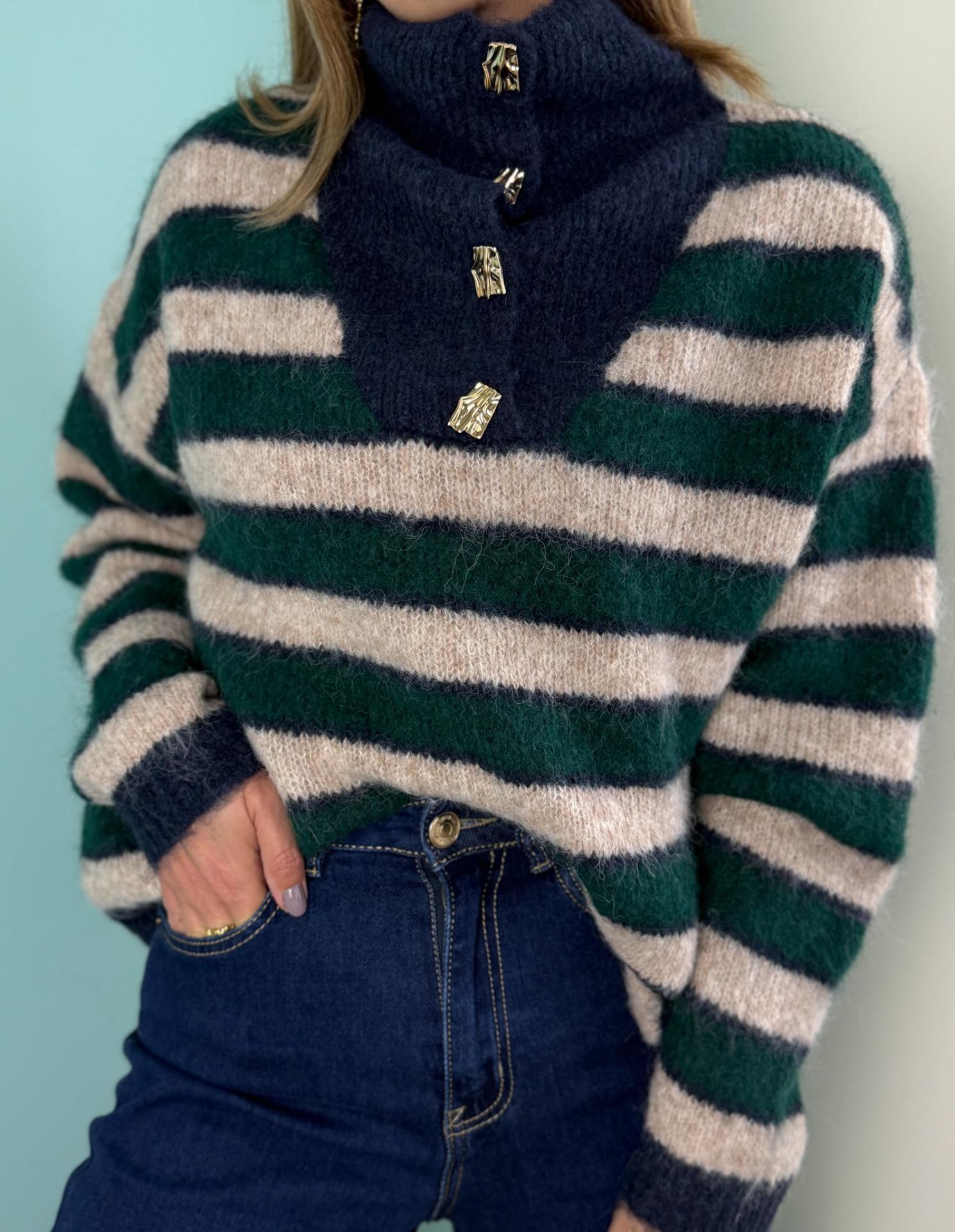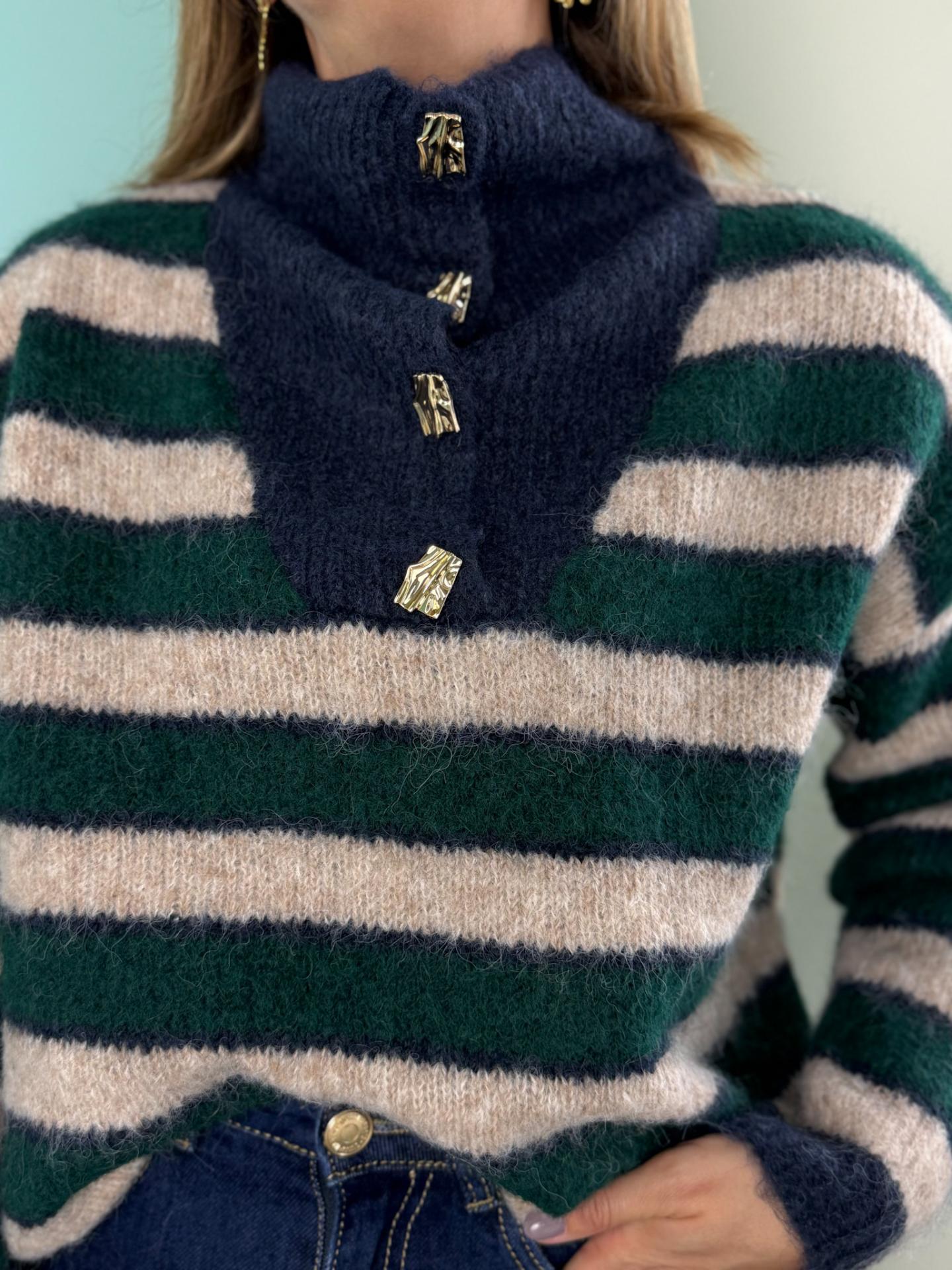 Camisola com gola abotada na frente em tons de azul, verde e bege.