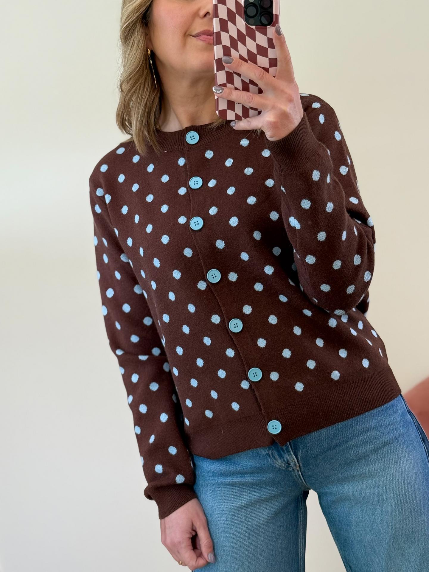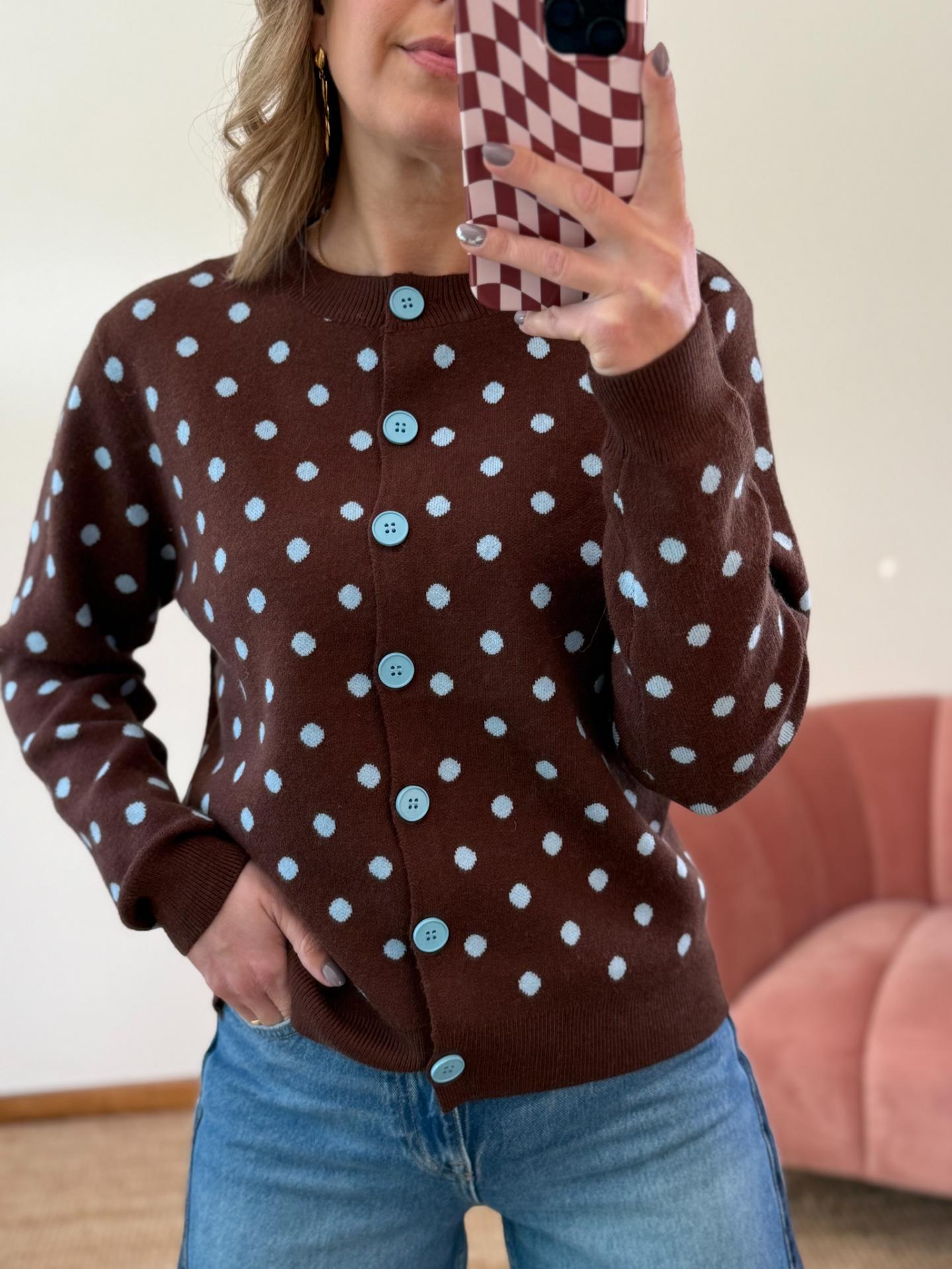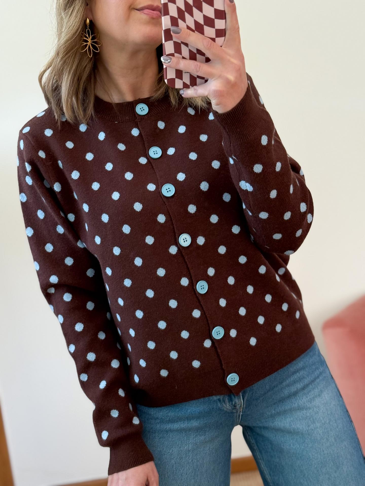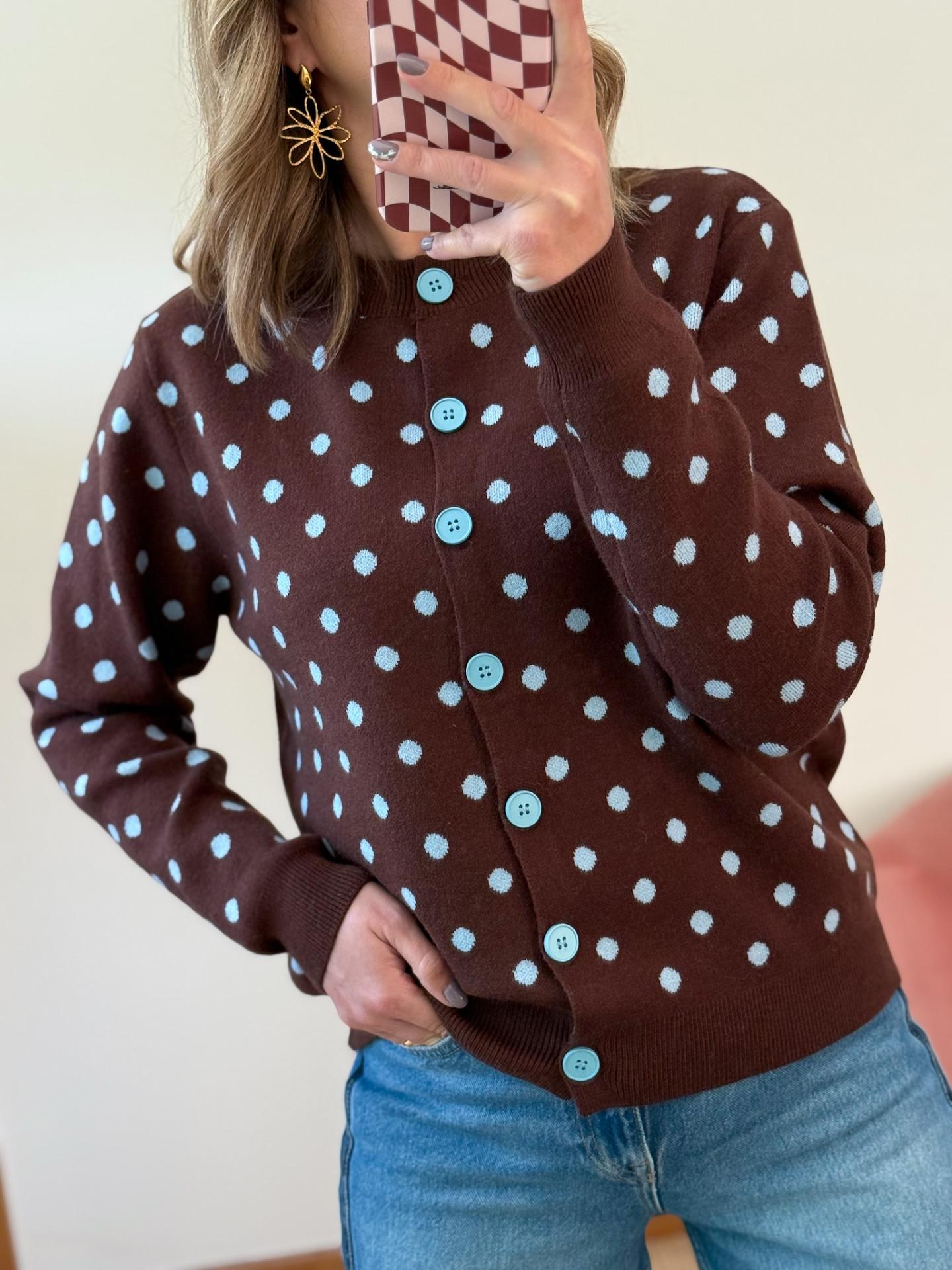 Cardigan chocolate com bolinhas tazuis com botões azuis.