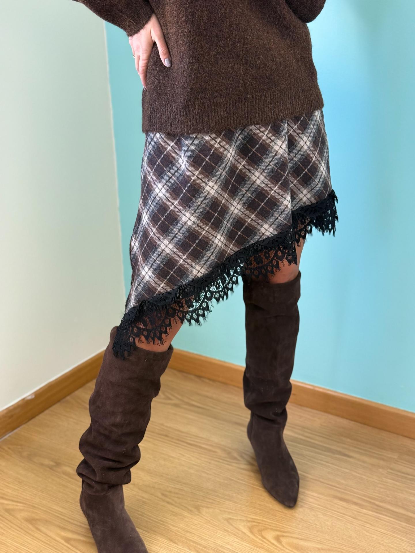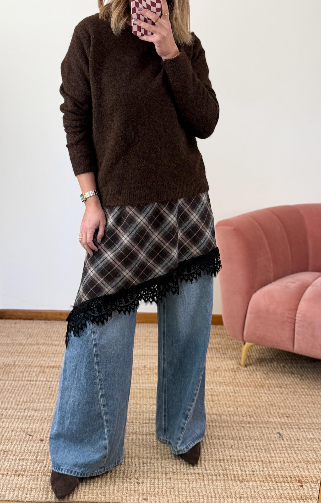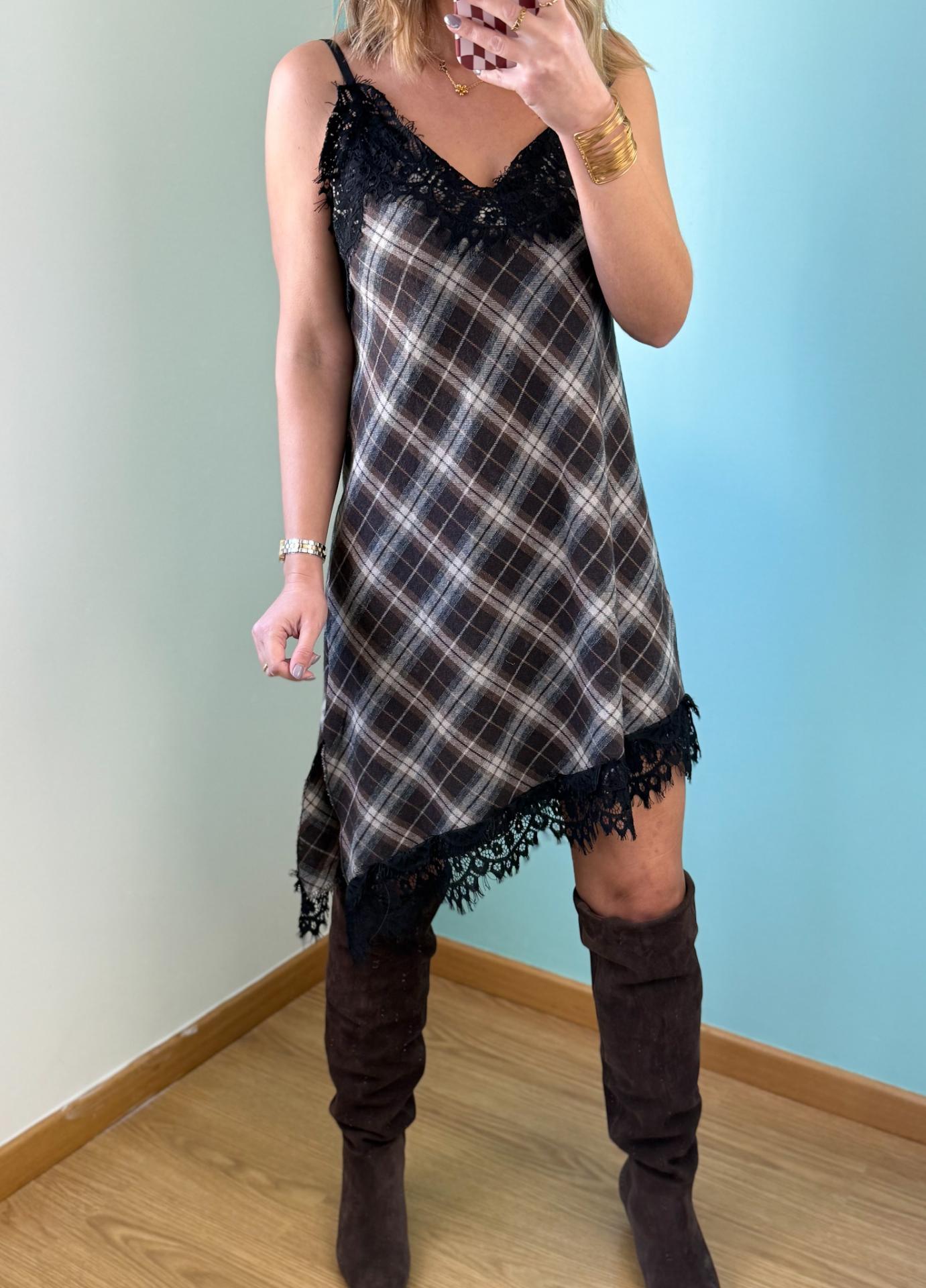 Vestido tartan em tons de chocolate, bege com renda. Alças ajustáveis e costas com elástico. Modelo super tendência e versátil. combina com as tuas malhas e com jeans!! Tecido flanela.