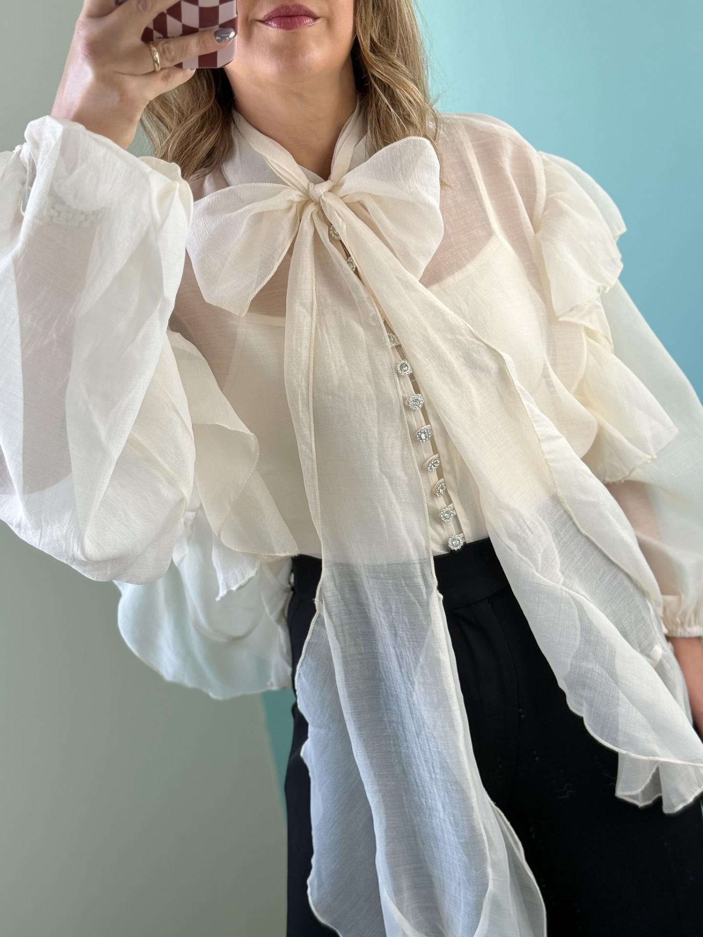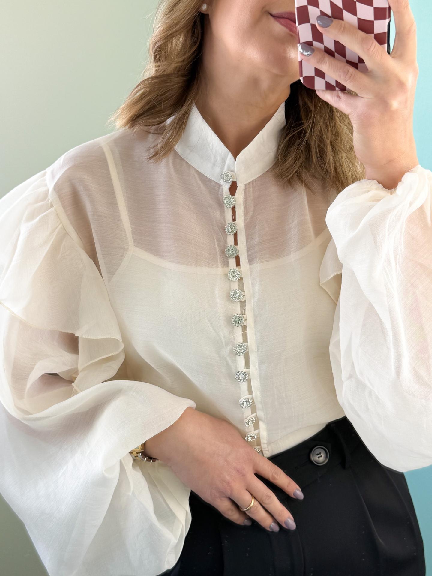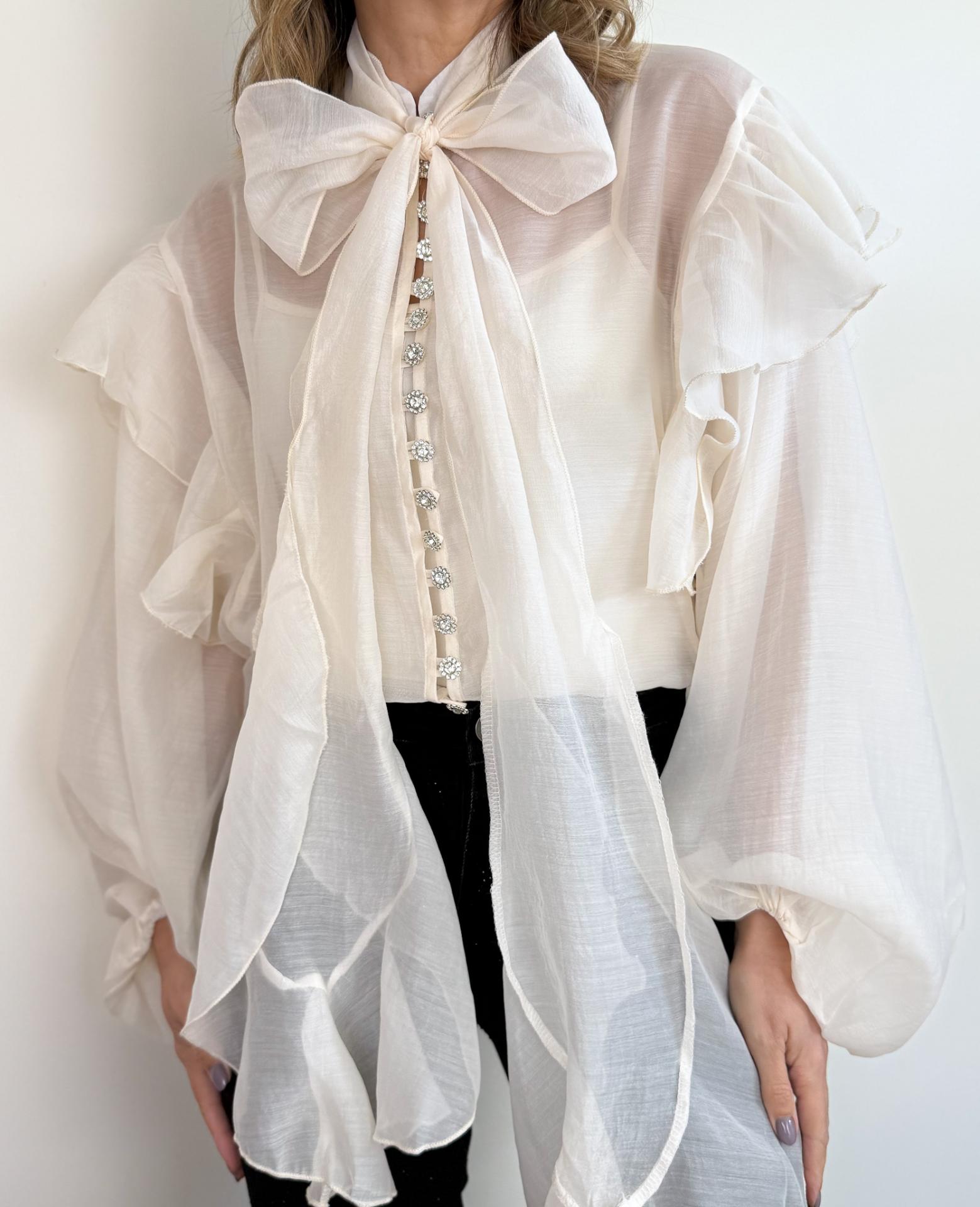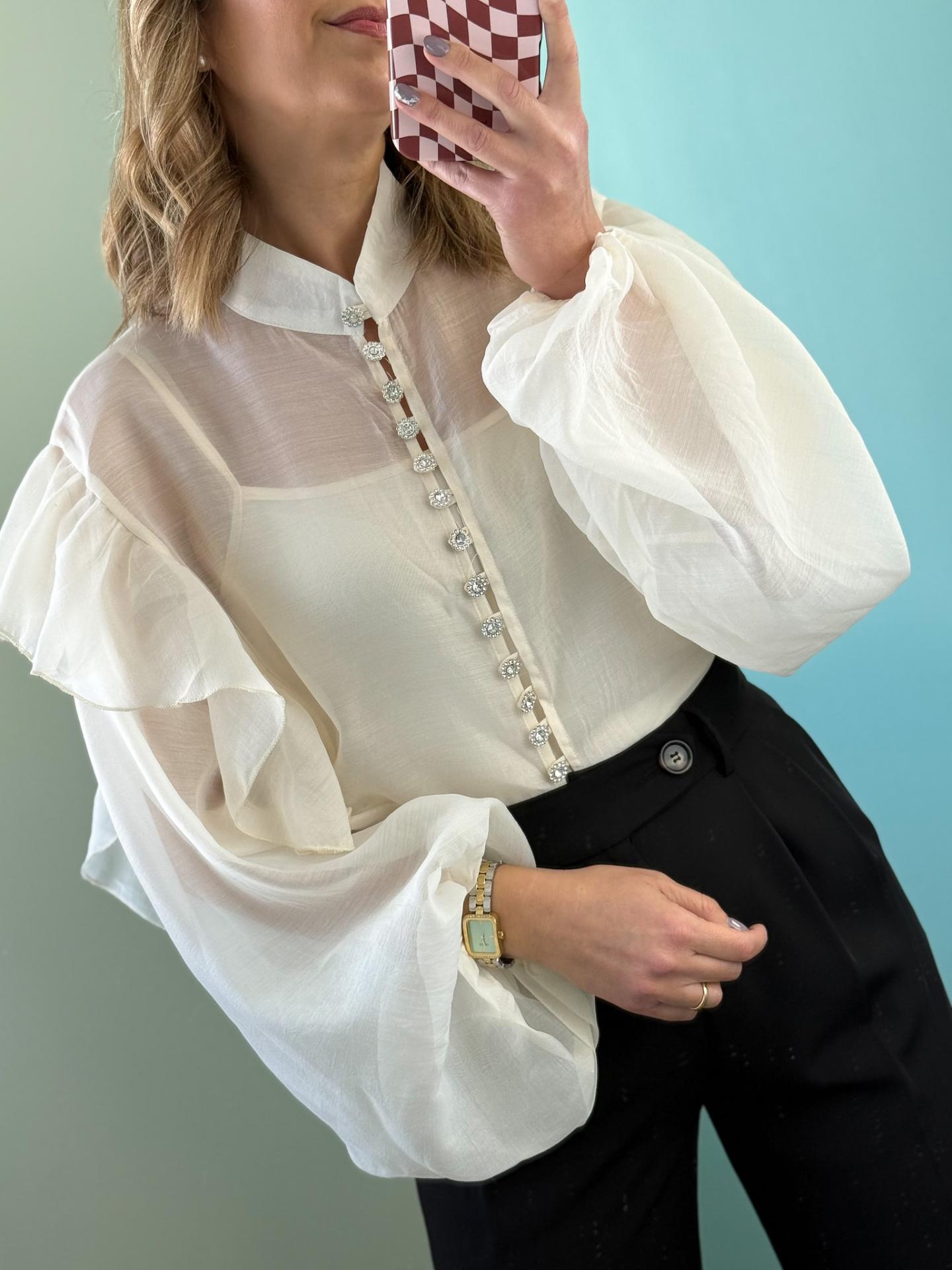 Blusa com botões pedra com folhos e com echarpe. Inclui top interior. Podes usar com ou sem a echarp onde fizemos uma laçada.
